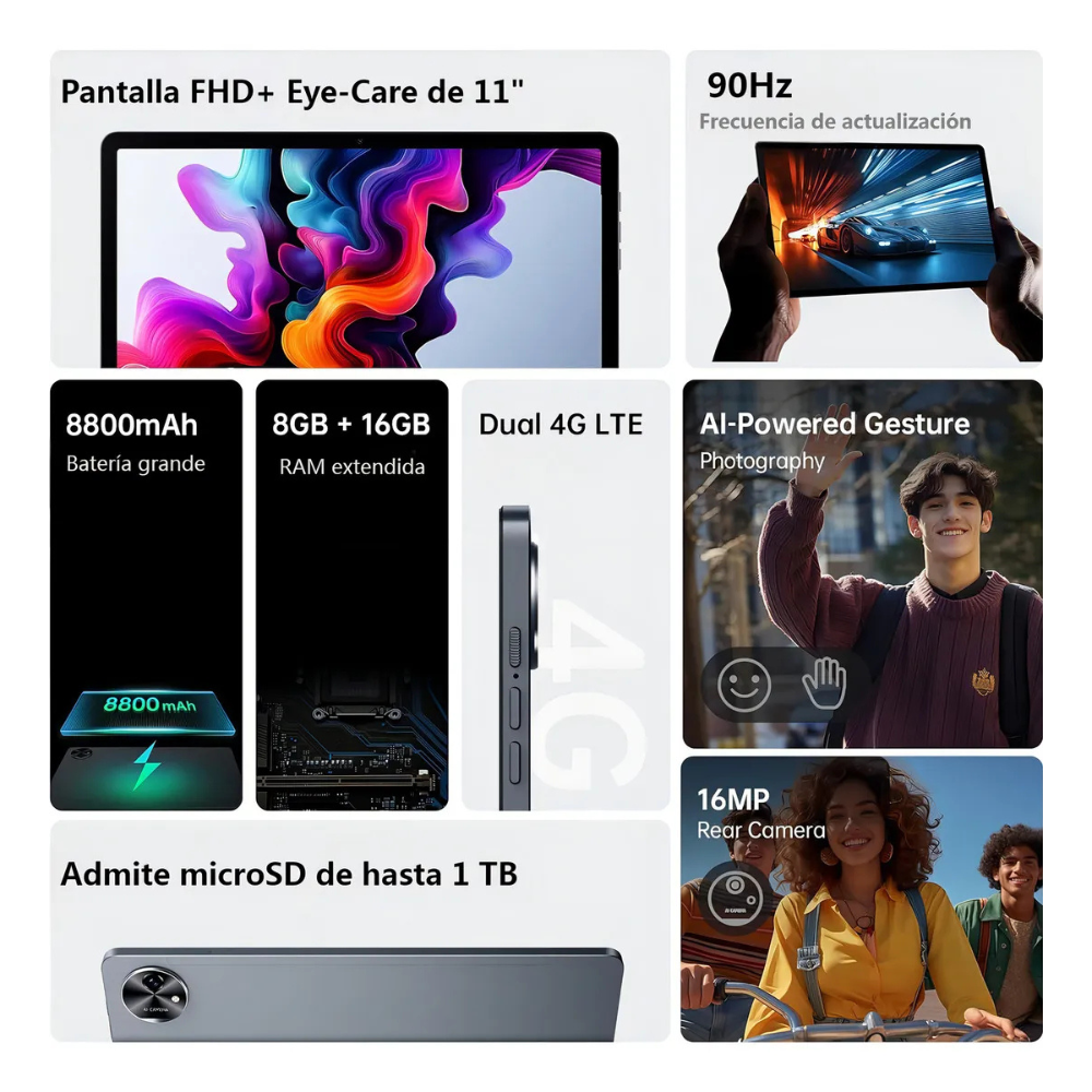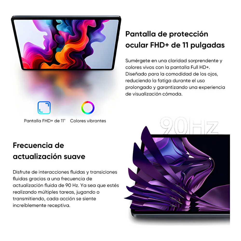 Pantalla 11" FHD+ (1200×1920): imágenes nítidas y confort ocular.