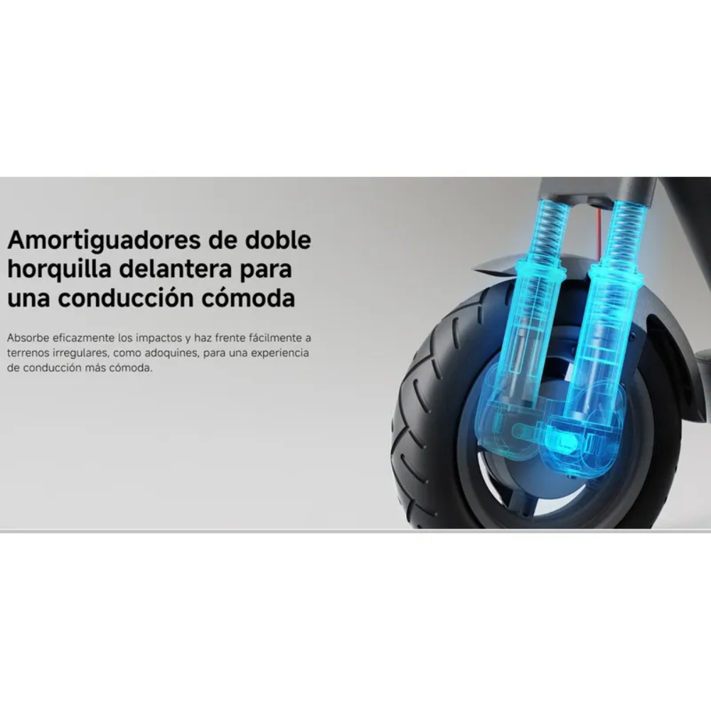 Su sistema de doble freno (E-ABS + tambor) y los amortiguadores delanteros de doble resorte garantizan una conducción suave y segura. Además, su estructura plegable de acero reforzado y su iluminación inteligente con faro automático, luz trasera e intermitentes integrados lo hacen el compañero perfecto para la ciudad.
